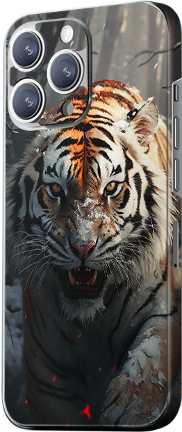 The design features a roaring tiger, exuding a strong sense of power and intimidation. The tiger’s fur is a classic combination of orange, black, and white stripes. The background depicts a dark gray forest, creating a tense and mysterious atmosphere.