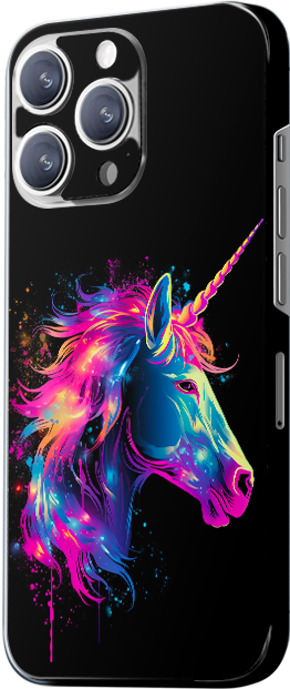 The design features a unicorn, presenting a dreamy and magical vibe. The unicorn’s body and mane are glowing in fluorescent colors, primarily blue, pink, and purple. The background is black, which emphasizes the unicorn’s mystical and fantastical appearance.