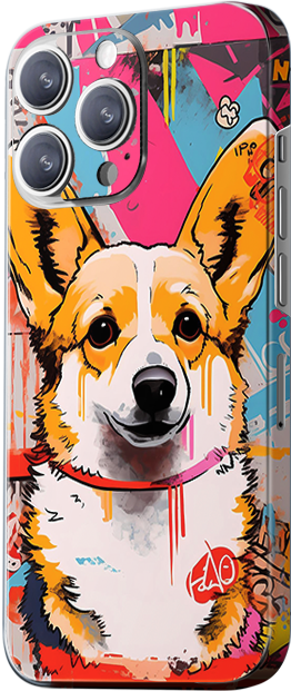 The design showcases a cartoon-style corgi with an adorable and friendly expression. The dog’s fur is a mix of yellow and white. The background is filled with vibrant street graffiti, featuring pink, blue, and orange as the primary colors, giving the design a lively and fun feel.