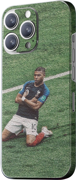 The design shows French footballer Kylian Mbappé’s iconic celebration move, where he is sliding on his knees on the grass with his arms crossed over his chest. The background is a green field, and Mbappé is wearing a navy blue and white jersey. The design is full of movement and sports energy.