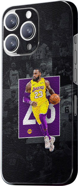 The design features an action shot of LeBron James dribbling the ball, wearing the Lakers’ number 23 jersey. The jersey is purple and yellow, with a black and white background. The simple design style highlights LeBron’s image even more.