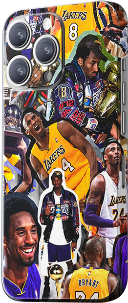 The design showcases several iconic moments of Kobe Bryant, combining different scenes of him wearing the Lakers jersey. The jersey is primarily purple and yellow, and the background includes many portraits and action silhouettes of Kobe. The overall design is rich in color, filled with nostalgia and respect.