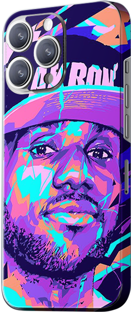 The design is a colorful portrait of LeBron James, using bold color blocks and a pop art style. The primary colors include purple, pink, blue, and orange, making the design very vibrant and modern, showcasing LeBron’s charisma and energy.