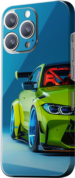 The design showcases a green modified sports car against a minimalistic blue geometric background. The low stance of the car emphasizes its personality and performance. The colors focus on green and blue, with the vibrant green car standing out boldly against the blue background. This energetic design is ideal for fans of racing and car customization culture.