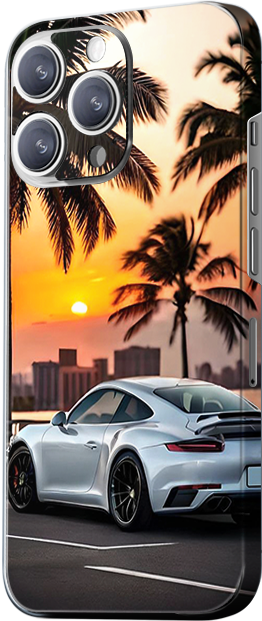The design depicts a silver sports car parked on a coastal road, with a sunset backdrop featuring palm trees and a city skyline. The atmosphere feels relaxed and romantic. The main colors are silver, orange, and black, with the soft glow of the orange sunset contrasting against the silver car. This design is perfect for those who appreciate a blend of nature and cityscapes.