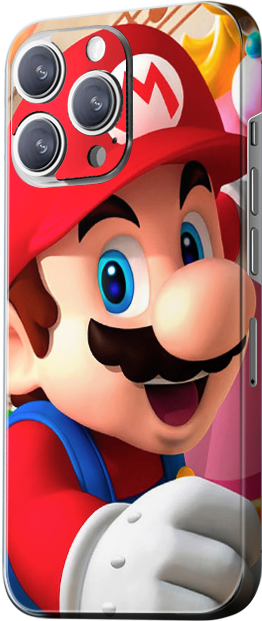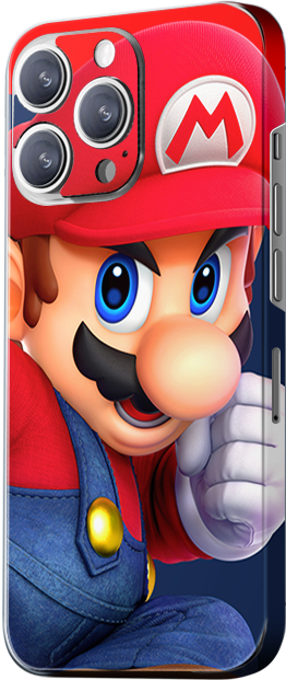 This design portrays Mario in a battle-ready pose, full of energy and determination. The background is red, and the main colors are red and blue, creating a dynamic and action-packed look.