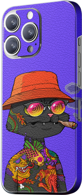 The design features a stylish, cool cat wearing trendy clothes, a hat, and sunglasses. The background is purple, and the design has a bold, unique, and fashionable feel. The primary colors are purple, orange, and green, giving a stylish impression.