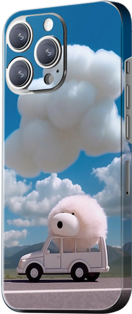 This design shows a cute cartoon animal sitting on a mini car, with a backdrop of blue skies and fluffy clouds. The main colors are blue and white, creating a relaxed and charming vibe.
