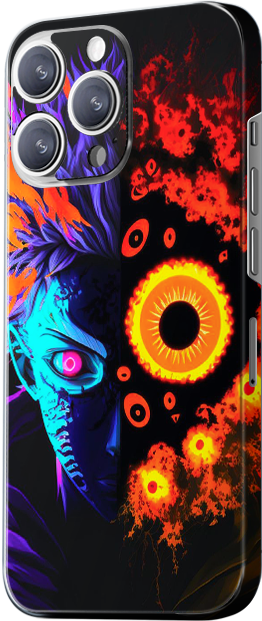 The design features a dynamic and mysterious anime character, surrounded by flames and vivid light effects. The character’s eye stands out sharply. The main colors are blue, orange, and black, conveying a sense of power and futuristic style.