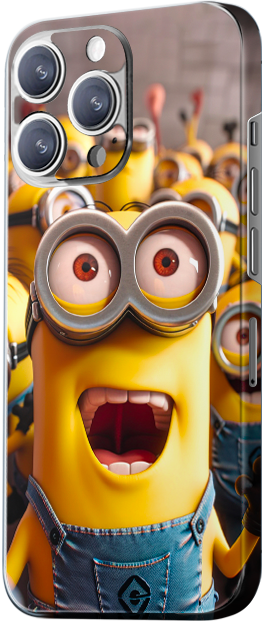This design showcases a Minion character with a wide-open mouth, expressing excitement or surprise. The background is filled with other Minions. The primary colors are yellow and blue, adding fun and energy to the design.