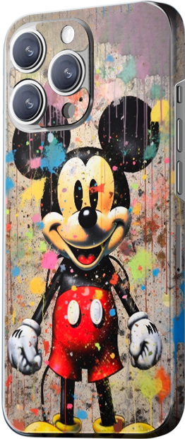 The design features the classic Mickey Mouse character with a graffiti-style colorful background. Mickey is wearing his iconic red shorts and yellow shoes. The main colors are red, black, and yellow, blending vintage and modern styles, perfect for Disney fans.