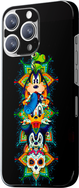 The design shows three cartoon characters stacked together, with Mickey Mouse on top. The overall design has a whimsical and colorful tone. The main colors are yellow, red, and green, creating a unique and fun vibe.
