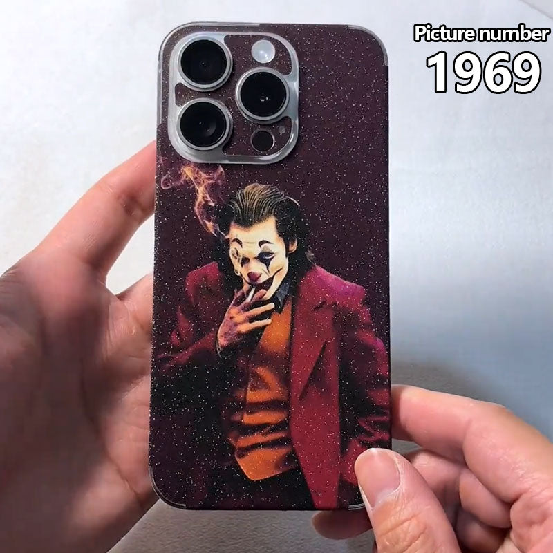The phone skin sticker features a character with clown makeup, smoking with a sinister look. The background is a dark, starry design, and the main colors are deep red, black, and orange, creating a mysterious and intense atmosphere.