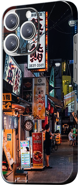 The design showcases a vibrant night scene on a Japanese street, with neon signs and small alleyways, evoking the busy city life. The main colors are orange, yellow, and black, capturing the essence of nightlife.