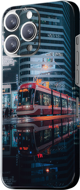 This design features a red streetcar moving through a city full of skyscrapers, with street lights and car traffic adding energy to the urban scene. The main colors are red and blue, making the design modern and dynamic.