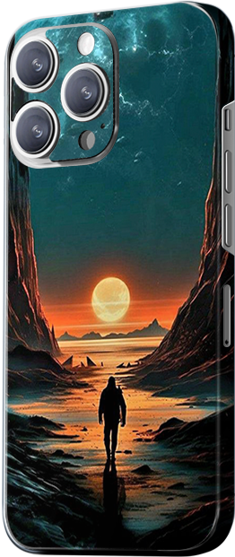 1731 (Bottom Right): The design shows a lone figure walking towards the beach at sunset. The glow of the sun reflects on the waves, creating a tranquil and reflective atmosphere. The main colors are orange, blue, and black, giving the design a mysterious and powerful feel.