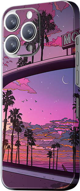 1783 (Bottom Left): This design depicts a city at sunset, with a purple sky silhouetting the cityscape. The backdrop of palm trees and the warm glow of the sunset creates a serene and beautiful scene. The main colors are purple and orange, giving the design a romantic and urban vibe.