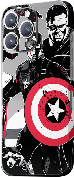 533 (Bottom Left): Features Captain America holding his shield in a combat stance. The background is in black and white, making the red shield stand out, embodying strength and justice. The primary colors are black, red, and white.