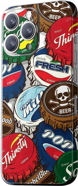 20 (Bottom Left): The design features various bottle caps from different brands, with beer logos and colorful graphics. The vibrant background adds a retro and playful vibe. The primary colors are red, blue, and brown.