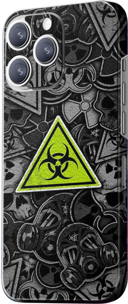 546 (Bottom Right): This design displays a biohazard symbol with intricate mechanical patterns in the background, evoking a sense of science fiction and danger. The main colors are black and green.